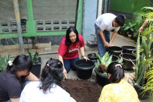 Kemudian beberapa siswa dan pendamping memecah tanaman sansivera di lapangan, lalu siswa lainnya bersama pendamping, membuat pupuk organik dari daun-daun dengan melibatkan warga sekitar. Siswa lainnya menanam sayuran, apotik hidup, tanaman perindang dan buah-buahan, Siswa dan pendamping membersihkan lingkungan sekolah (lapangan, parkiran, halaman depan, kelas, kantin). Kemudian siswa lainnya menata dan merawat tanaman, membersihkan daun, menata ulang tanaman dengan memotong daun yang sudah kuning, menyapu lapangan, parkiran, dan halaman depan.